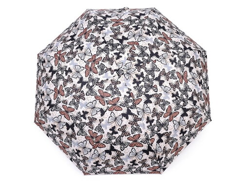 (14974)Dámsky skladací dáždnik s potlačou motýľov. Zložený dáždnik má dĺžku len 19 cm a ľahko sa zmestí do kabelky.Dáždniková štruktúra pozostáva z ôsmich polí. Odolá silnému nárazovému vetru, pružné lamely zaistia odolnosť a stabilitu. UV filter chráni pred slnečným žiarením. Rukoväť dáždnika je plastová a má šnúrku.