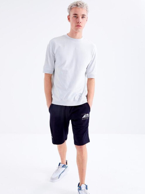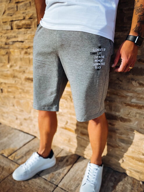 (16036)Pánske štýlové kraťasy v nádhernej sivej farbe s potlačou. Šortky sú doplnené o vrecká a šnúrky v páse v čiernej farbe. Šortky siahajú tesne nad kolená.