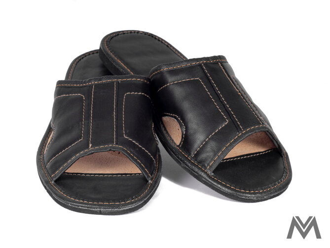 Kožené pánske papuče v čiernej farbe s otvorenou špičkou. Papuče sú prešívane béžovou niťou. Vďaka otvorenej špičke a bočnými otvormi sú papuče vhodné na letné obdobie, prípadne pre pánov, ktorí majú radi voľnosť a pohodlie počas celého dňa. Papuče sú kožené z vnútornej strany, po určitom čase sa prispôsobia tvaru chodidla a nemusíte sa obávať žiadnych otlakov. Vrchný čierny diel je ušitý z kvalitnej eko kože. Potešte svojich blízkych praktickým darčekom a venujte im papuče, ktoré si zaručene obľúbia.