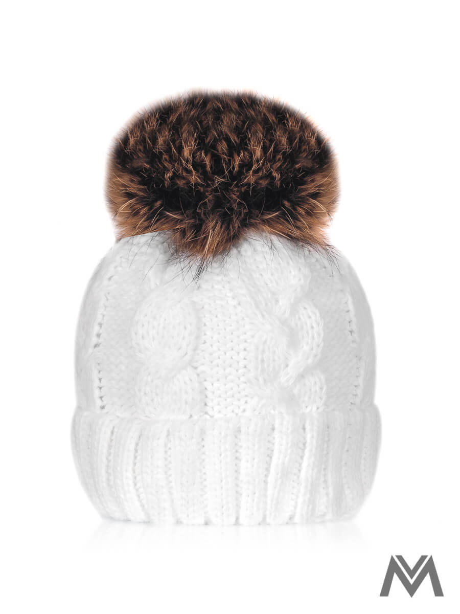 Dámska vlnená čiapka, bielej farby s pravým kožušinovým brmbolcom, ktorý si drží svoj tvar. Tento model zdobia zaujímavé pletene vzory. Čiapka je zateplená podšívkou ktorá udržiava teplo. Je vhodná aj ako elegantný doplnok ku klasickému čiernemu kabátu na oživenie Vášho celkového outfitu.
