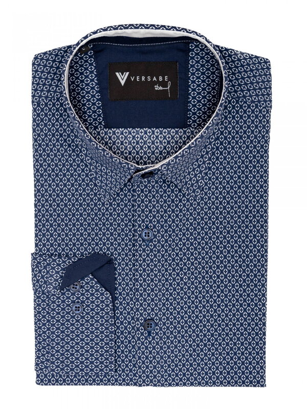 Nádherná košeľa pre muža vhodná o práce, na pracovné stretnutia aj na rôzne príležitosti. Zaujímavý moderný golier. Košeľa je tmavomodrej farby so zaujímavým bielym vzorom.