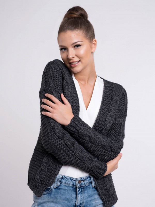 Krásny sveter v tmavošedej farbe so zaujímavým pleteným vzorom. Sveter je z pohodlného a príjemného materiálu na dotyk, má dlhé rukávy. Sveter je podobného strihu ako sako, takže ho mžte využiť aj ako sako. Je to dobrý doplnok v zime ako sveter pod bundu alebo aj cez leto sveter na prehodenie v chladnejších večeroch.