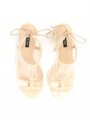Klasické dámske sandále v béžovej farbe na stĺpovom opätku sa hodia takmer k hocičomu a preto by nemali chýbať v žiadnom dámskom šatníku. Opätok má výšku 10 cm a obvod 15 cm, čo sú najčastejšie používané miery pri podobnom druhu obuvi. Topánky sú vyrobené z hladkej imitácie kože, ktorú je potrebné ošetrovať výhradne za použitia vlhkej handričky, bez akýchkoľvek agresívnych prostriedkov, ktoré by mohli spôsobiť povrchové poškodenie, či stratu farby. Topánky sú zo zadnej strany päty vybavené šnúrovaním, pre jednoduchšie obúvanie.