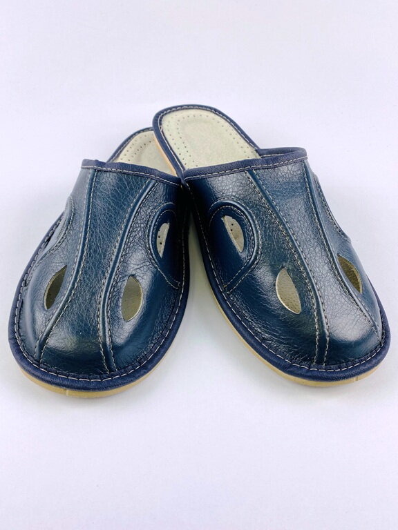 Letný model papúč. Papuče sú zvnútra celo-kožené a vystlané mäkkou ortopedickou stielkou. Vonkajšia časť je potiahnutá kvalitnou ekokožou. Po stranách a v prednej časti papúč sú výkroje v tvare polmesiačika. Okolo výkrojov a po celom obvode papúč je nádherné prešívanie svetlou nitkou. Papuče sú v krásnej modrej farbe. Päta papúč je otvorená.