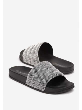 Nádherne pohodlné dámske šľapky v čiernej farbe s ozdobnými kvetmi. Úžasny kúsok na leto ľahko kombinovateľné s čímkoľvek. Šľapky sú doplnené o nádherne čierne kvety ktoré majú v strede krásny trblietavý detail.