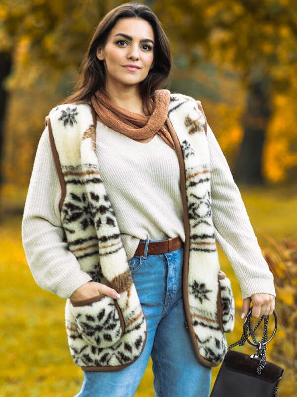 Štýlová moderná dámska vesta v nádhernej béžovej farbe s hnedými doplnkami. Vesta je doplnená o štýlové väčšie vesta. Vesta je vyrobená z prijemného mäkkého materiálu z pravej ovčiej vlny. Dámska vesta, ktorá Vás dostane dokolien. Vhodná aj ako darček pod vianočný stromček.