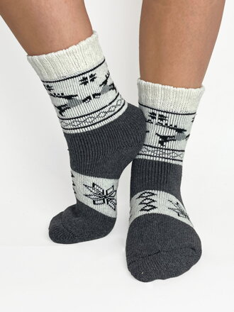 Dámske biele alpákové ponožky v modernom dizajne so vzorom JELEŇA v bielo-sivej kombinácií. Tieto ponožky sú zateplené z pravej vlny - alpaky.