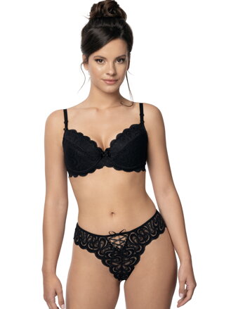 Predná časť je zdobená efektným šnúrovaním, ktoré dodáva nohavičkám jedinečný a zmyselný detail. Strih typu tanga krásne tvaruje postavu, opticky predlžuje nohy a zároveň zabezpečuje, že sa nepodtlačujú pod oblečením.